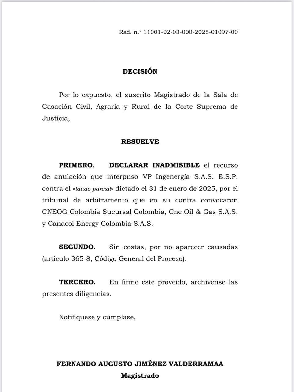 Facsimil de la última página del fallo de la Corte Suprema que inadmitió una tutela que interpuso Canacol Energy