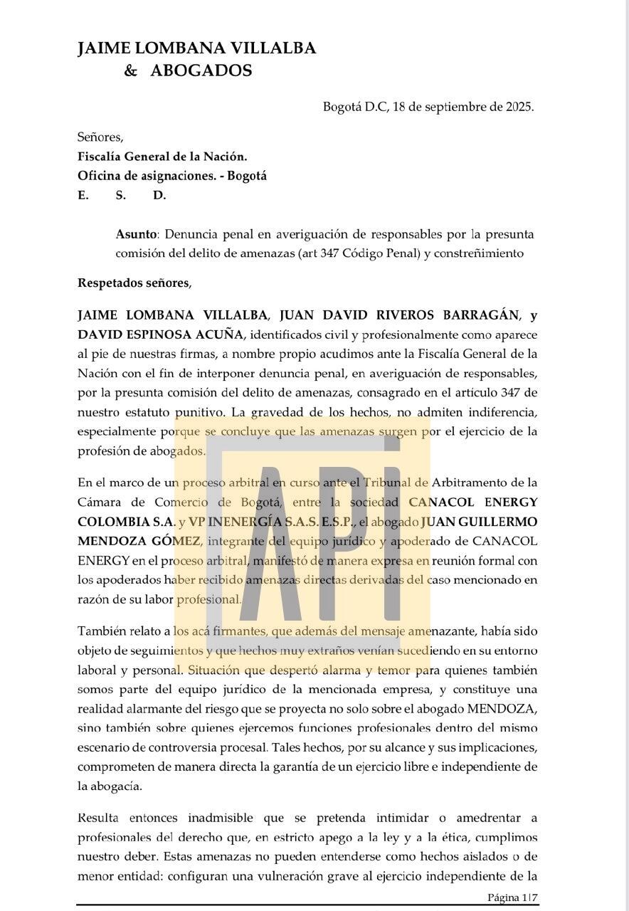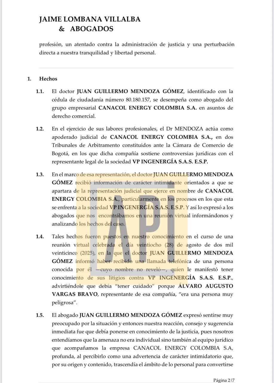 Más adelante, en la denuncia en poder de esta Agencia (ver facsímil), Mendoza “expresó sentirse muy preocupado por la situación y entonces nuestra reacción, consejo y sugerencia inmediata fue que debía ponerse en conocimiento de la justicia, pues nosotros entendíamos que la amenaza no era individual sino también al equipo jurídico que acompañamos la empresa Canacol Energy Colombia S. A., profunda, al percibirlo como una advertencia de carácter intimidatorio que, por su origen y contenido, trascendía el ámbito de lo personal para convertirse en una amenaza GRAVE E INADMISIBLE en contra de su integridad y del ejercicio profesional de abogado”.