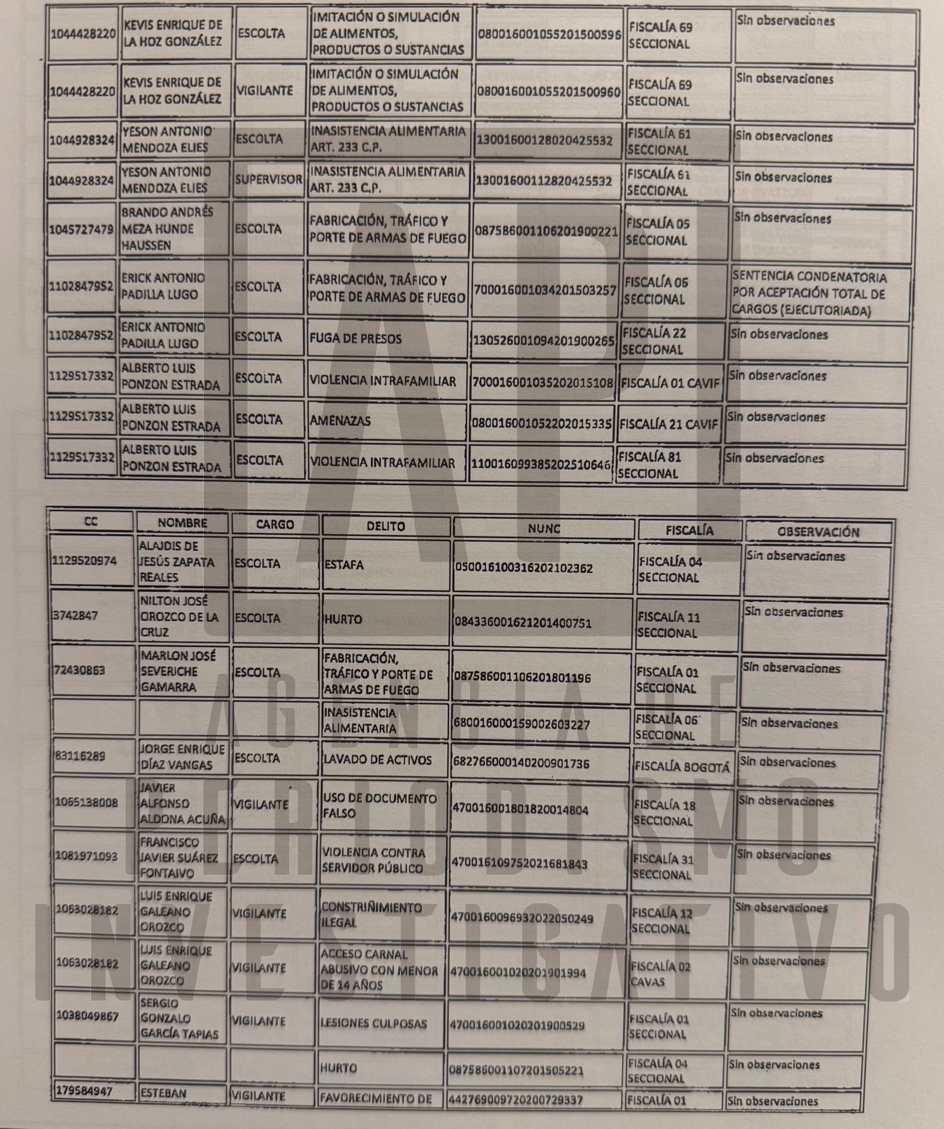 Imagen: suministrada / Facsimil de uno de los listados del empleados de Atenas con sus antecedentes penales.