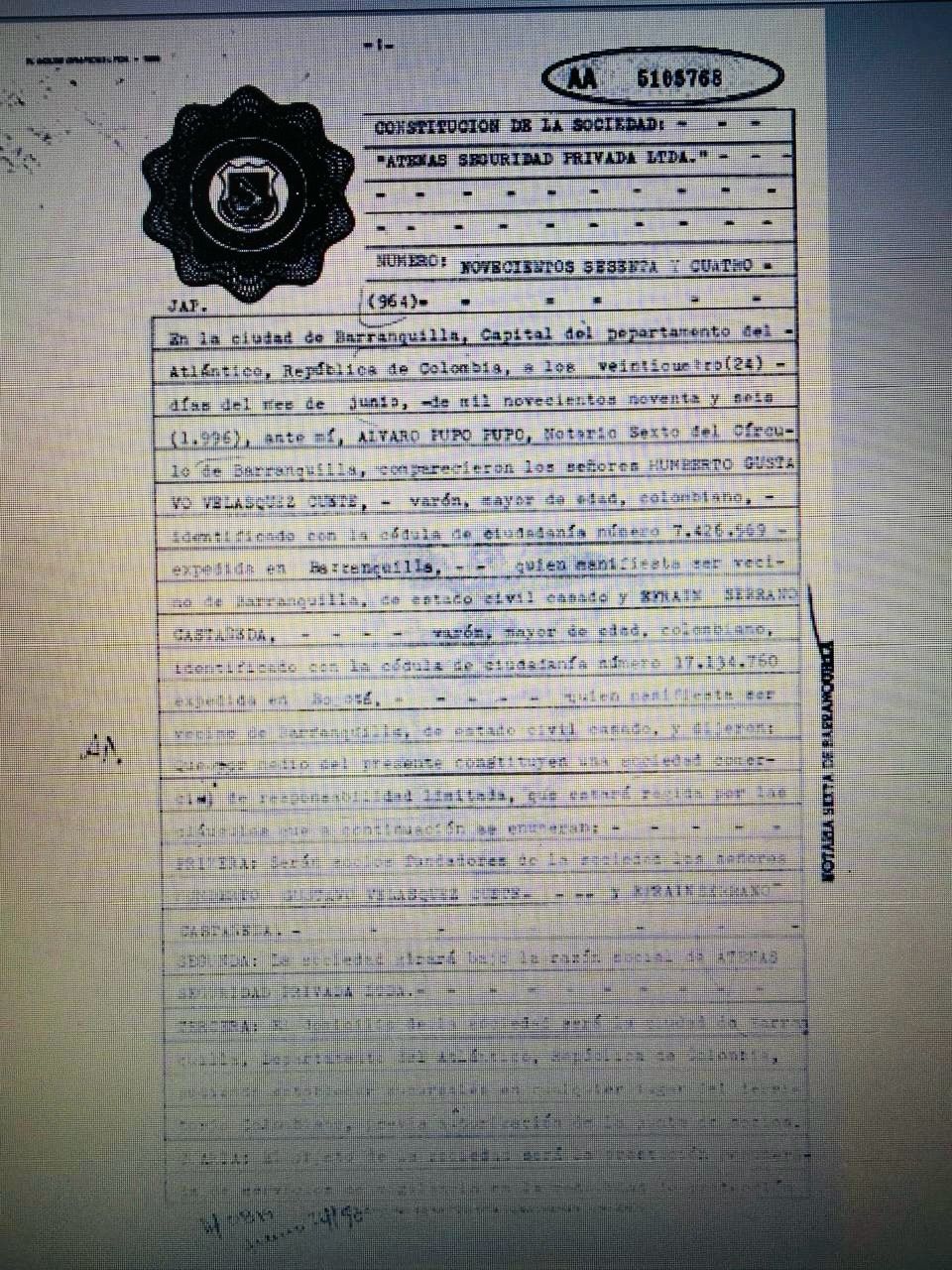 Atenas Seguridad Privada Ltda. fue constituida mediante escritura pública el 24 de junio de 1996 en la Notaría Sexta de Barranquilla. Para ese momento, los socios fundadores fueron Humberto Velásquez Cuete y Efraín Serrano Castañeda, con un capital de $85,3 millones.