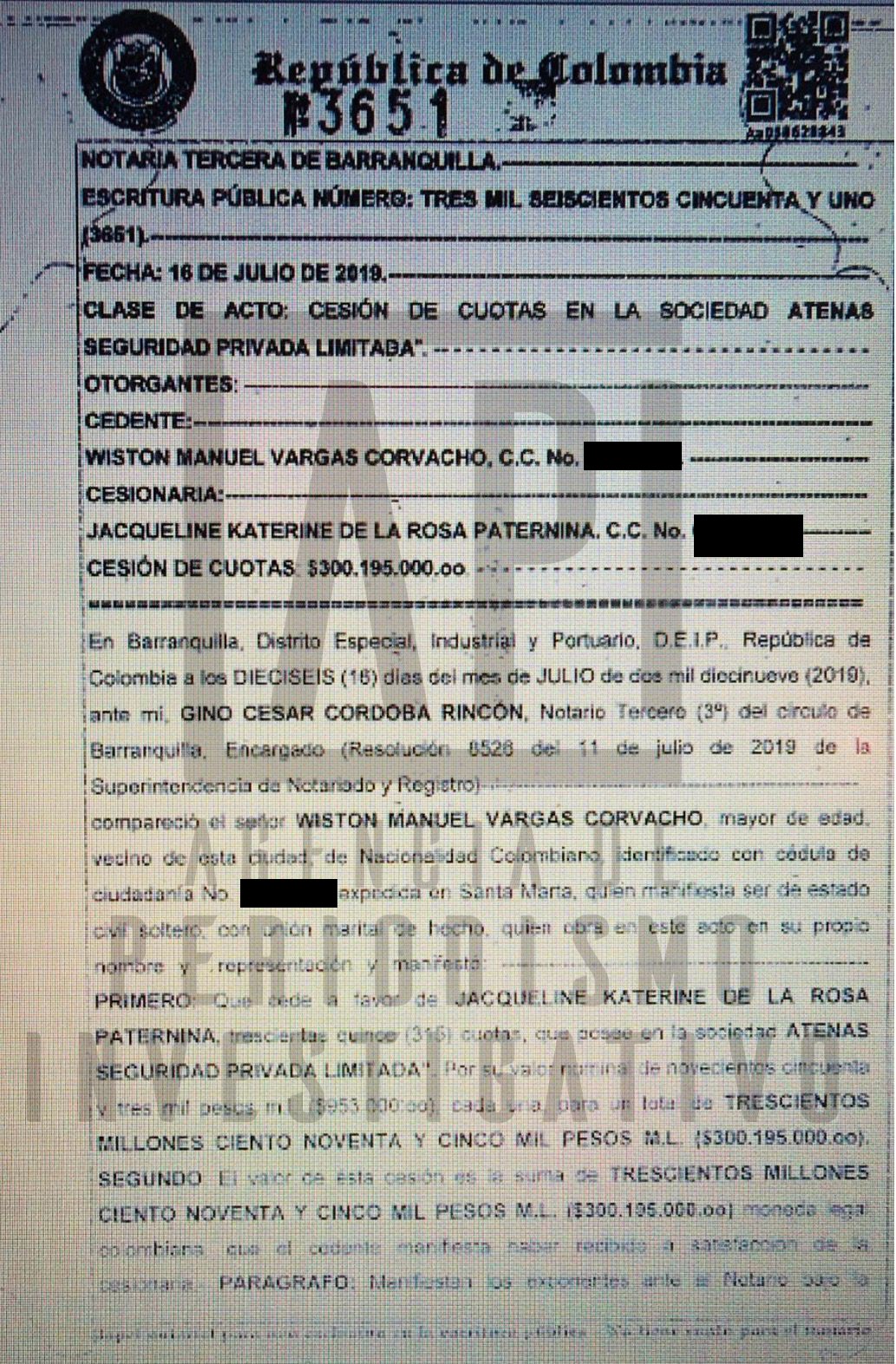 Tres meses después de la acción de tutela, en la que la mujer le esbozó al juez que ese bien era su poco patrimonio, en la misma Notaría Tercera de Barranquilla suscribió la escritura 3651, en la cual adquiría la cesión de cuotas de la empresa Atenas Seguridad Privada Ltda. por $309.195.000 a Wiston Manuel Vargas Corvacho.