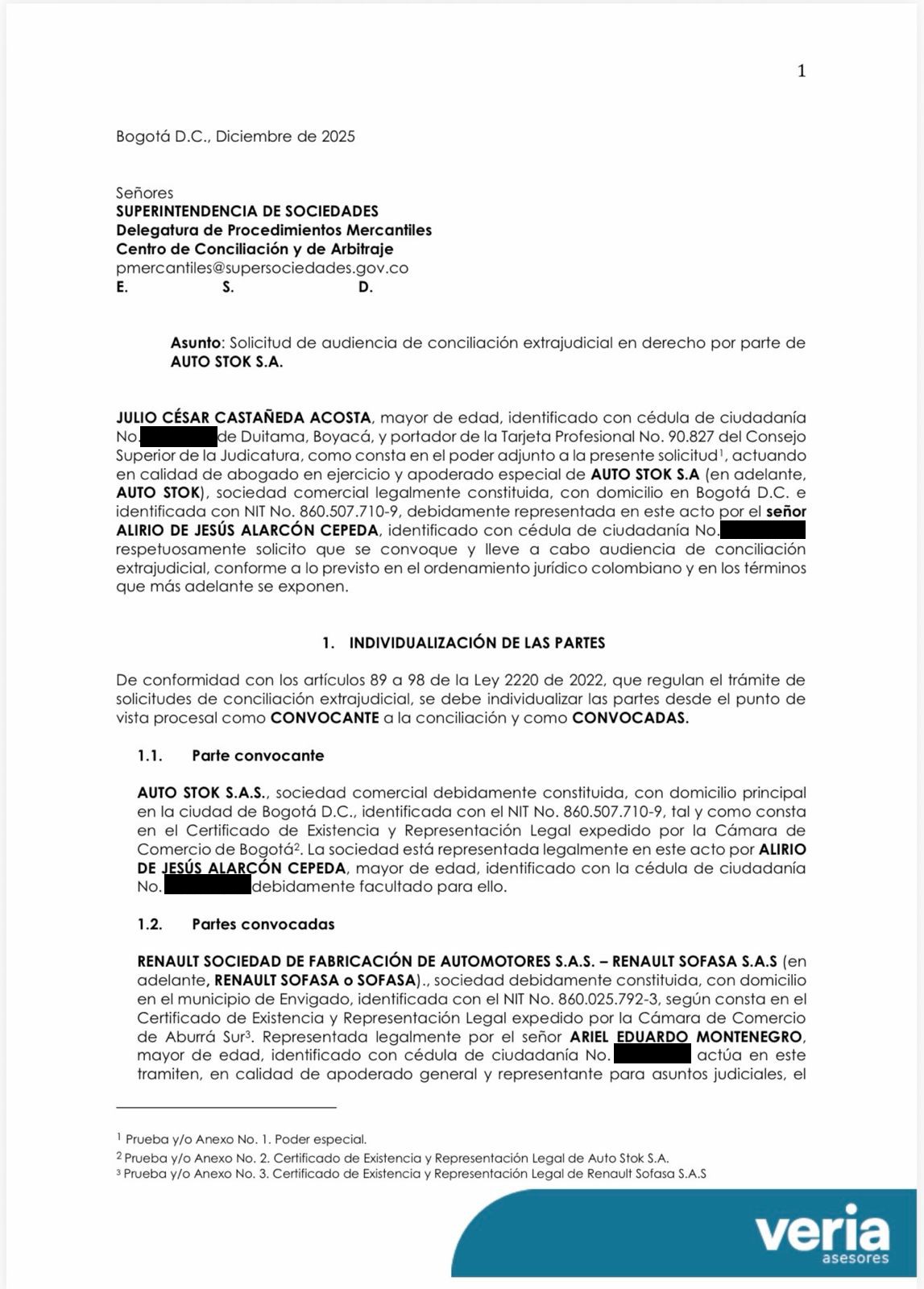 En la solicitud, Auto Stok pidió que la audiencia de conciliación sirva para lograr un acuerdo integral con Renault Sofasa y RCI, orientado a resolver extrajudicialmente las diferencias surgidas por la ejecución, las prórrogas y la terminación del contrato suscrito el 27 de enero de 2021, así como por las decisiones comerciales y financieras adoptadas durante la relación entre las partes.