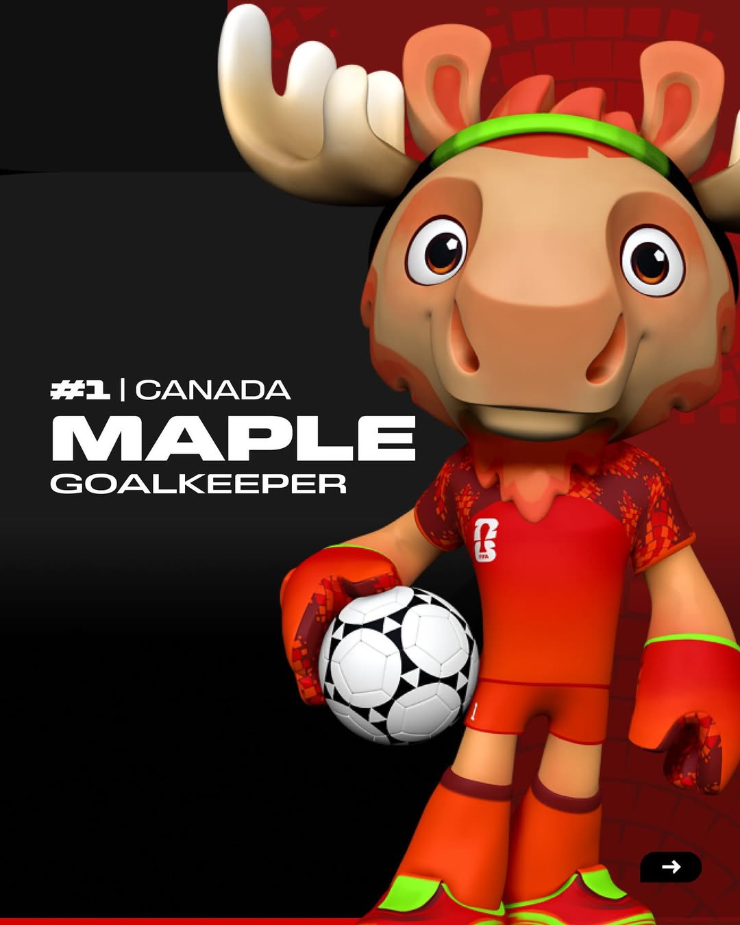 En el caso de Canadá, la mascota seleccionada es un alce llamado Maple. Su uniforme es de color rojo, lo que remite directamente a los colores representativos de la selección nacional de fútbol canadiense.