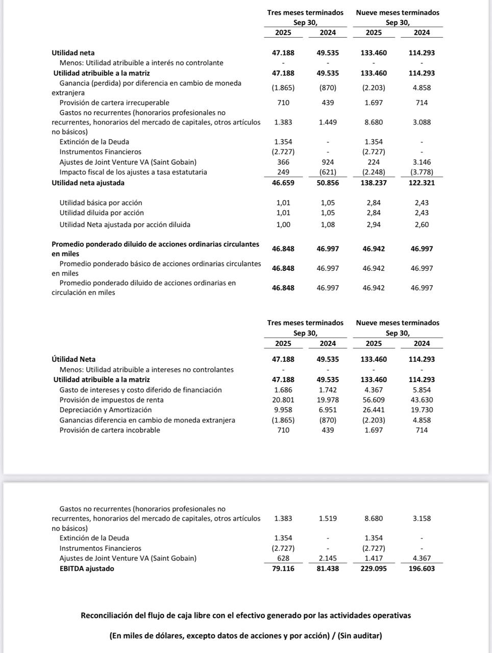 La utilidad neta fue de 47,2 millones de dólares, o 1,01 dólares por acción diluida, en el tercer trimestre de 2025, comparada con 49,5 millones de dólares, o 1,05 dólares por acción diluida, en el trimestre del año anterior. Estos resultados incluyen una ganancia no operativa y no monetaria por diferencia en cambio de 1,9 millones de dólares en el tercer trimestre de 2025 y una ganancia de 0,9 millones de dólares en el tercer trimestre de 2024.