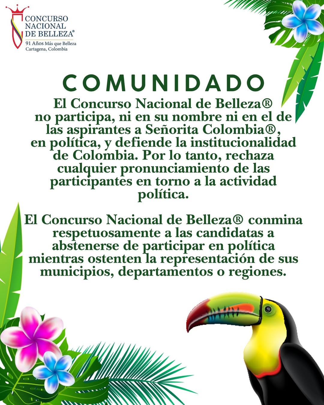 “El Concurso Nacional de Belleza no participa, ni en su nombre ni en el de las aspirantes a Señorita Colombia, en política, y defiende la institucionalidad de Colombia. Por lo tanto, rechaza cualquier pronunciamiento de las participantes en torno a la actividad política”, señaló la organización en su declaración oficial.