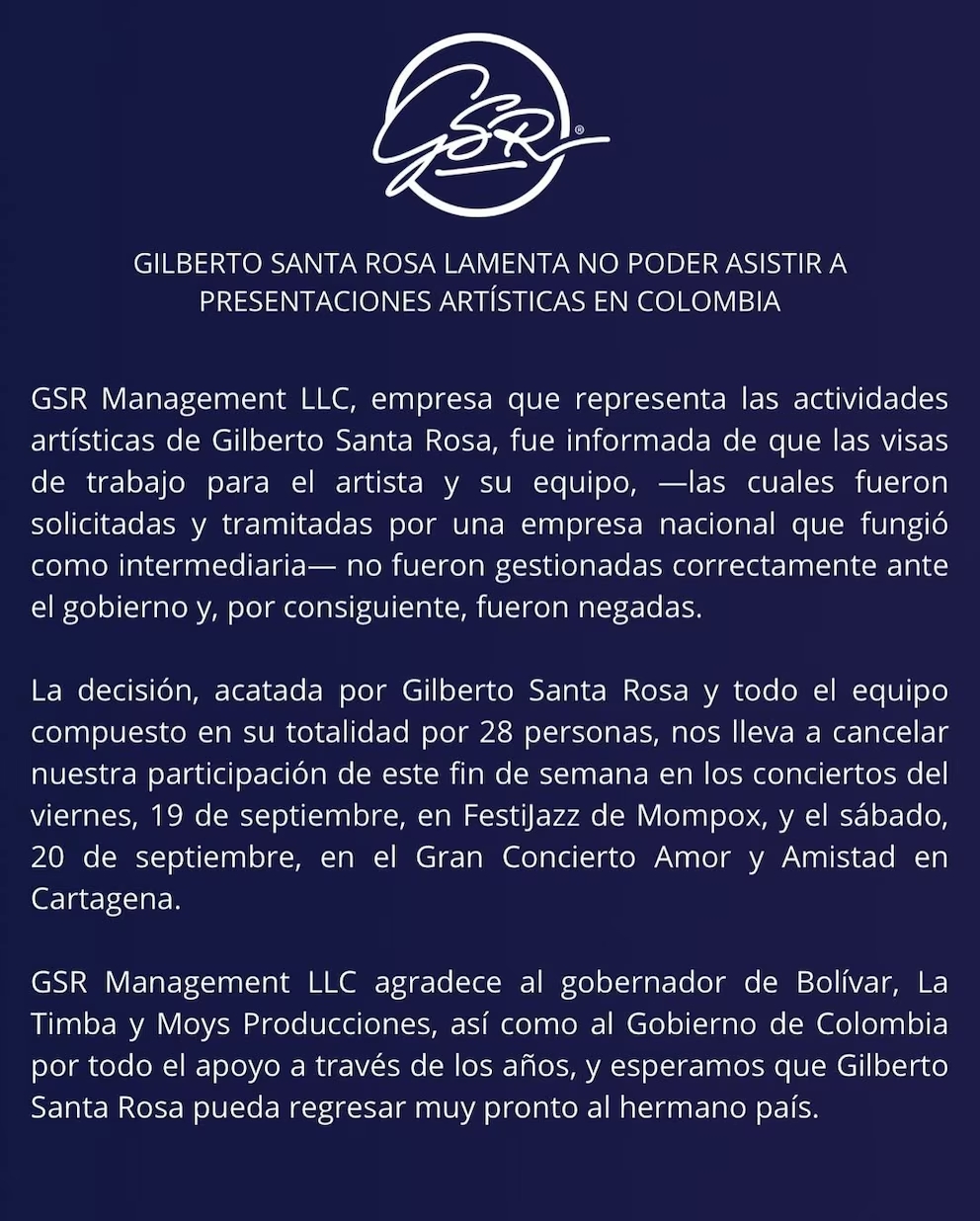 El cantante puertorriqueño Gilberto Santa Rosa no pudo cumplir con sus compromisos en Colombia este fin de semana, tras la negación de las visas de trabajo para parte de su orquesta y personal de apoyo. La decisión obligó a cancelar los conciertos programados en el Festijazz de Mompox y en el Gran Concierto Amor y Amistad en Cartagena, dejando a cientos de seguidores sin el esperado reencuentro.