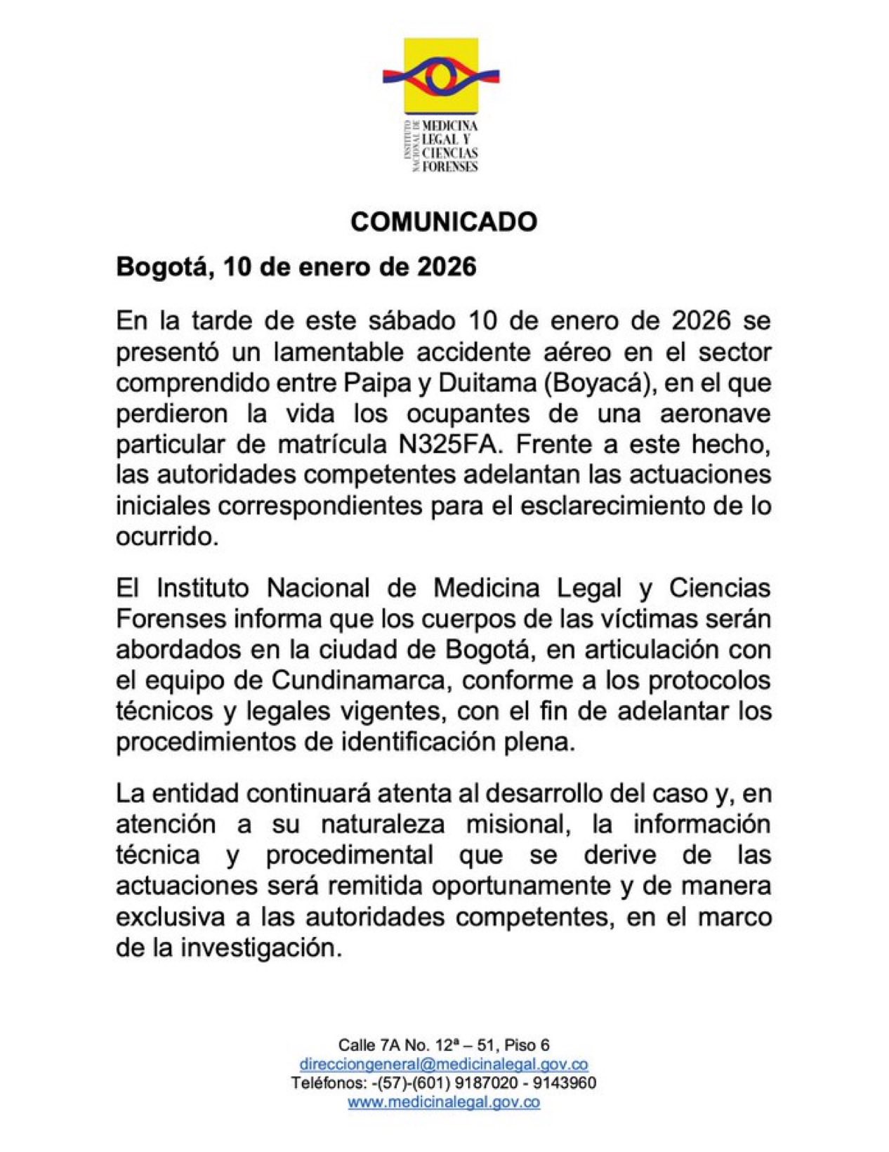 Medicina Legal también precisó que toda la información técnica y procedimental generada a partir de estas actuaciones será remitida de manera exclusiva y oportuna a las autoridades competentes. Esta información se utilizará estrictamente "en el marco de la investigación" que busca esclarecer las causas del siniestro.