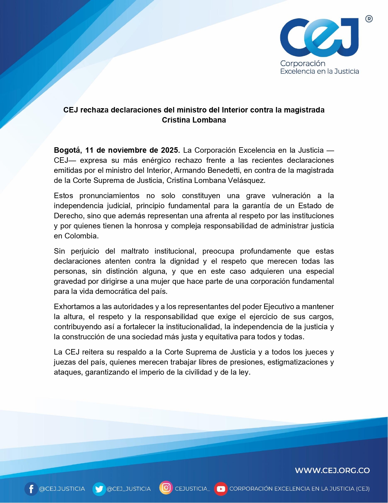 La Corporación Excelencia en la Justicia (CEJ) expresó su “más enérgico rechazo” a las declaraciones del ministro del Interior, Armando Benedetti, en contra de la magistrada de la Corte Suprema de Justicia, Cristina Lombana Velásquez.