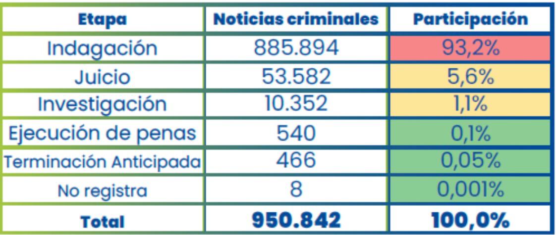 En 2024 ingresaron 1,87 millones de noticias criminales al Sistema, en su mayoría por denuncia ciudadana (55,6%), querellas (26,6%) e investigaciones iniciadas mediante actos urgentes o primeras diligencias que se adelantan una vez ingresa la noticia criminal al SPOA (14,7%). Sin embargo, el 93,2% de los casos activos quedó estancado en la etapa preliminar de indagación, sin avanzar a la etapa de juicio.