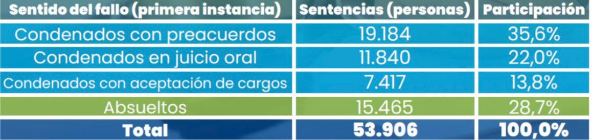 En los eventos en los que hay condenas, estas provienen en su mayoría de preacuerdos (35,6%) y aceptaciones de cargos (13,8%), mientras que solo el 22,0% resulta de un juicio que surtió todas las etapas previstas en la ley. En la práctica, el sistema depende más de la negociación de penas y de cargos que de la confrontación probatoria.