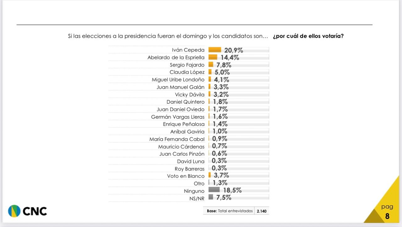 La fotografía de este momento muestra al senador Iván Cepeda, del Pacto Histórico, en el primer lugar con 20,9 % de intención de voto.