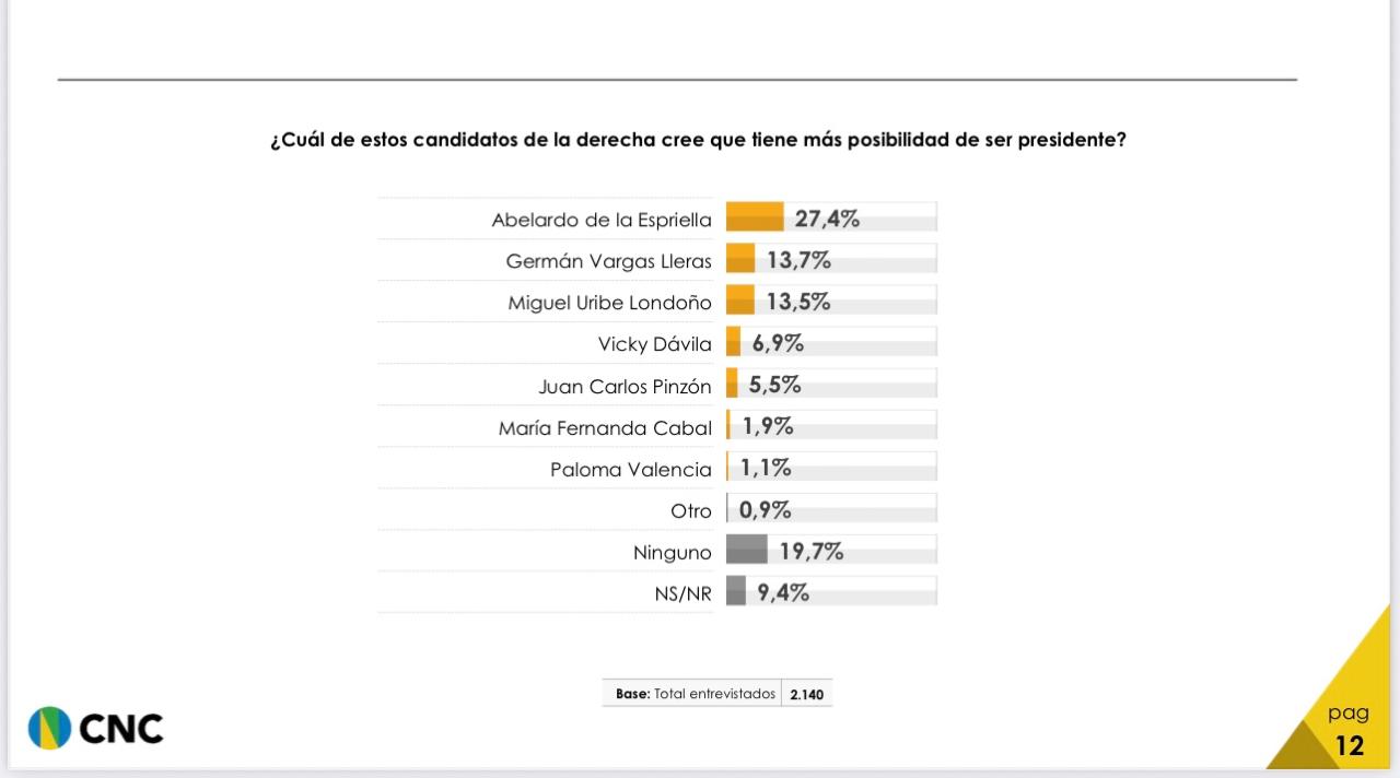 Uno de los puntos que más debate generará es la fotografía que la encuesta ofrece sobre la derecha. Cuando el CNC pregunta directamente cuál precandidato de derecha tiene más opciones de llegar a la Presidencia, De la Espriella encabeza con 27,4 %, seguido por Germán Vargas Lleras con 13,7 % y Miguel Uribe Londoño con 13,5 %.