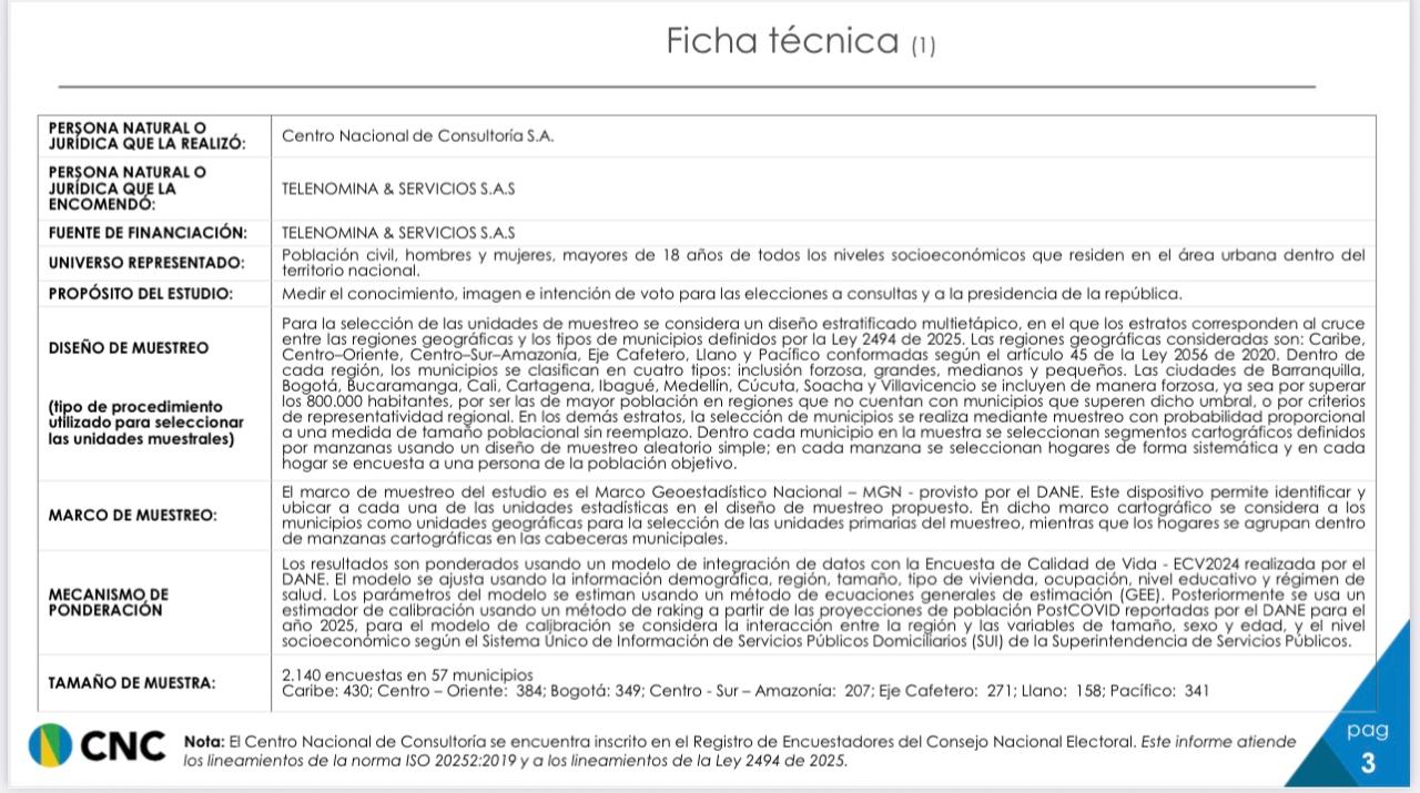 Los resultados se ponderaron con base en la Encuesta de Calidad de Vida 2024 del DANE, de acuerdo con la ficha publicada por el propio Centro Nacional de Consultoría.