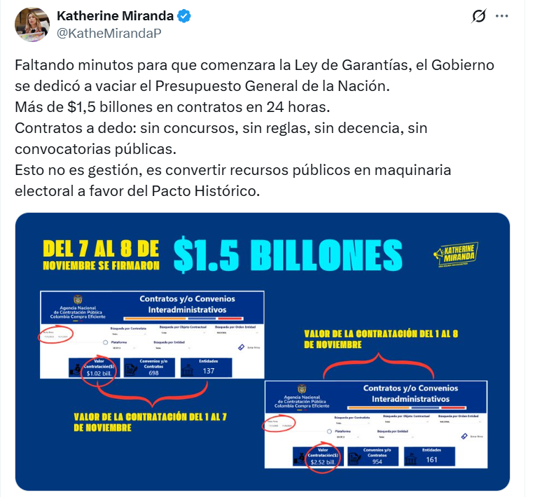 "Faltando minutos para que comenzara la Ley de Garantías, el Gobierno se dedicó a vaciar el Presupuesto General de la Nación. Más de $1,5 billones en contratos en 24 horas", manifestó Miranda.