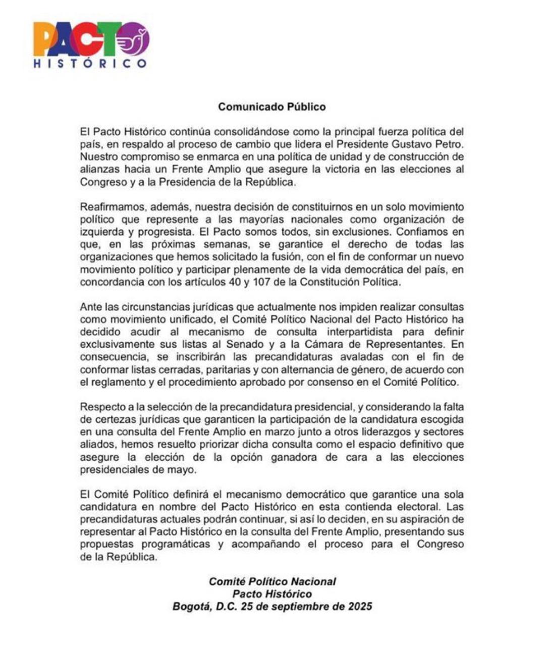 Ante las circunstancias jurídicas que actualmente nos impiden realizar consultas como movimiento unificado, el Comité Político Nacional del Pacto Histórico ha decidido acudir al mecanismo de consulta interpartidista para definir exclusivamente sus listas al Senado y a la Cámara de Representantes.