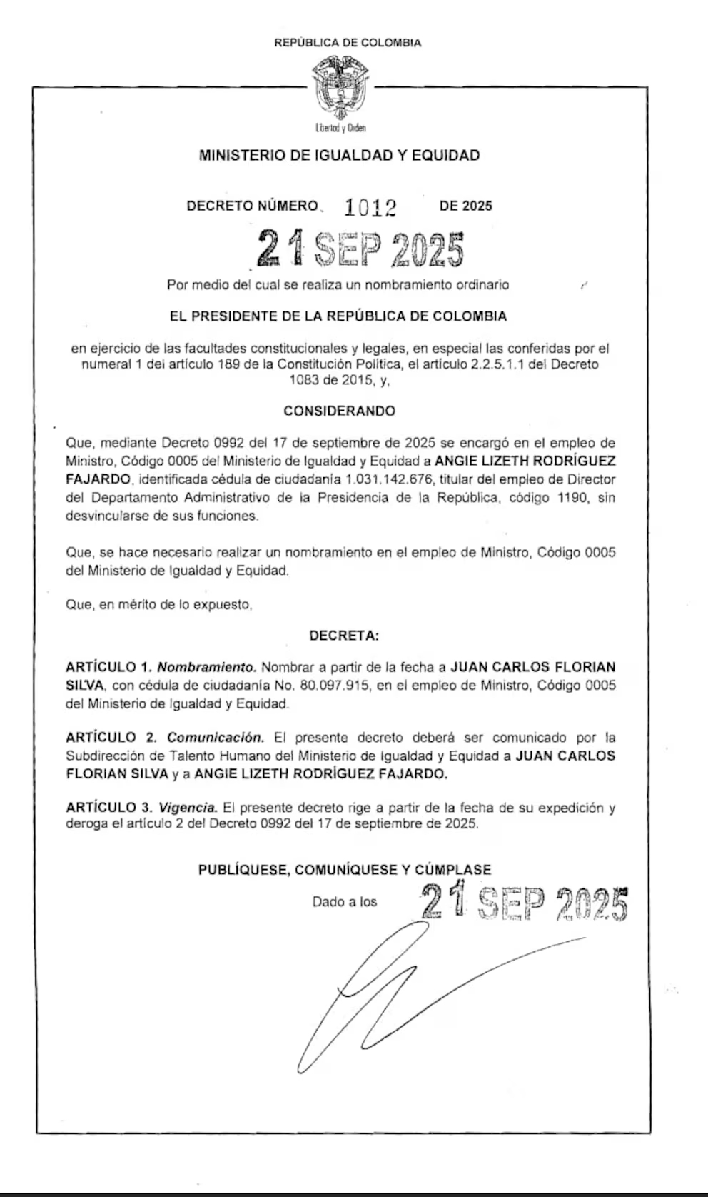 El presidente Gustavo Petro oficializó el regreso de Juan Carlos Florián al Ministerio de Igualdad y Equidad, tras varios días de controversia por el cumplimiento de la ley de paridad en el gabinete. El decreto 1012 de 2025, firmado el 21 de septiembre, designa nuevamente a Florián como titular de la cartera y devuelve a Angie Lizeth Rodríguez a sus funciones en el Departamento Administrativo de la Presidencia (Dapre).